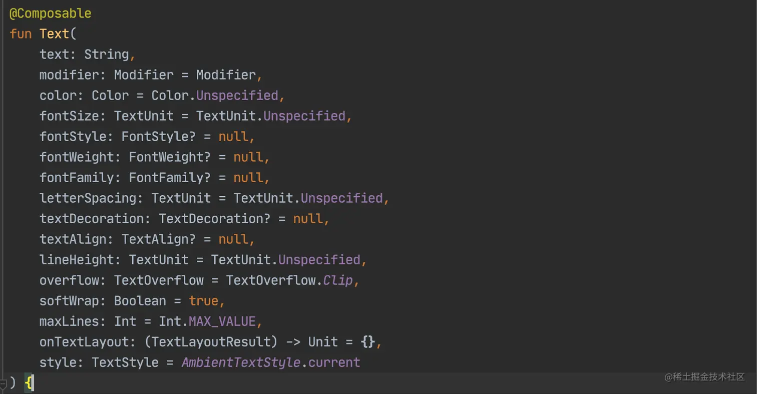 回到上一节的例子,我们使用了一个 Text 组件声明了一段文本 View,从代码格式上看,可以说是一种声明式的写法,这一点跟 Swift UI 高度一致,确实可以当做是一种新的语法去入门。但实际上整个 Activity 还是 .kt 的文件,还是要作为 Kotlin 源码参与编译,这段声明本质上也还是 Kotlin 代码,Text 就是一个不符合常规函数命名的函数: