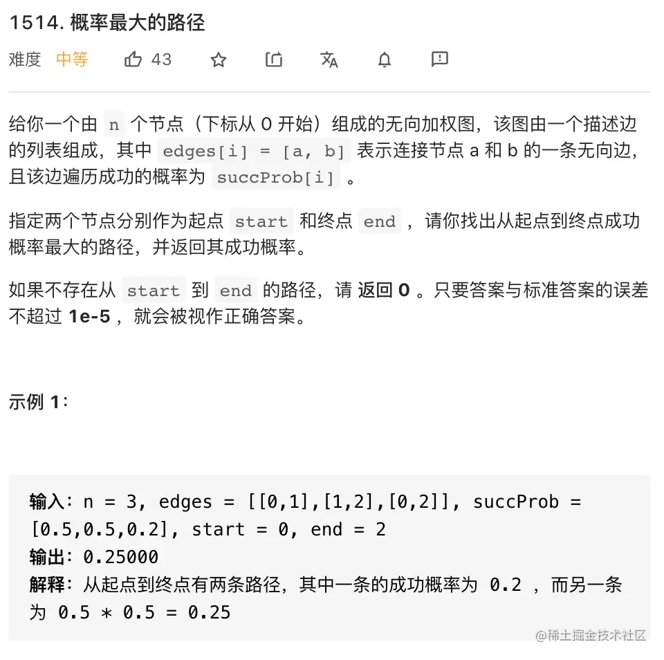 这道题目问“从起点到终点成功概率最大的路径”,并且我们可以发现每条路径都是有权重的:edges对应不同的概率。所以,从已知信息可以发现这道题目用Bellman-Ford算法是可解的。