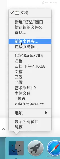 1.鼠标右键点击「访达」图标,选择「前往文件夹」: