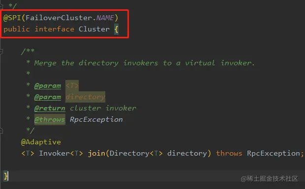 然后在注解上可以配置默认的 key 来选择默认的实现类,比如 Cluster 默认的实现是 failover。