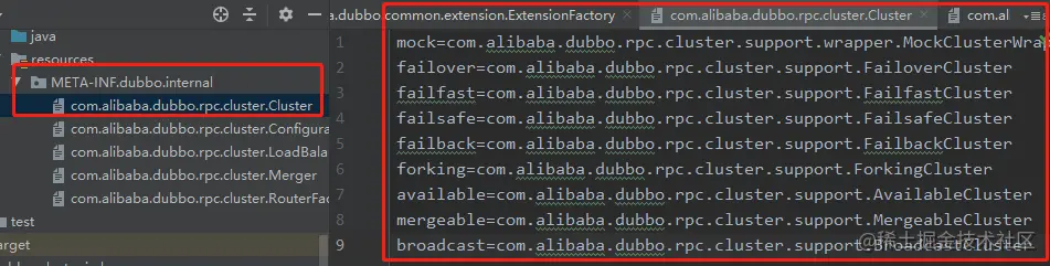 - META-INF/dubbo/internal/ :这里是存放 Dubbo 内部使用的 SPI 配置文件。