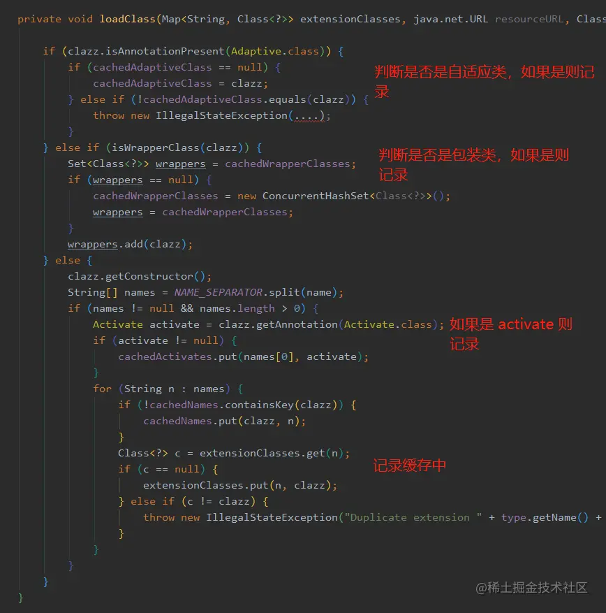 源码中的 loadDirectory 就是去目录找文件,然后解析,最终会调用 loadClass,这个方法很关键,我们详细分析一下,为了便于观看,删除了一些代码。