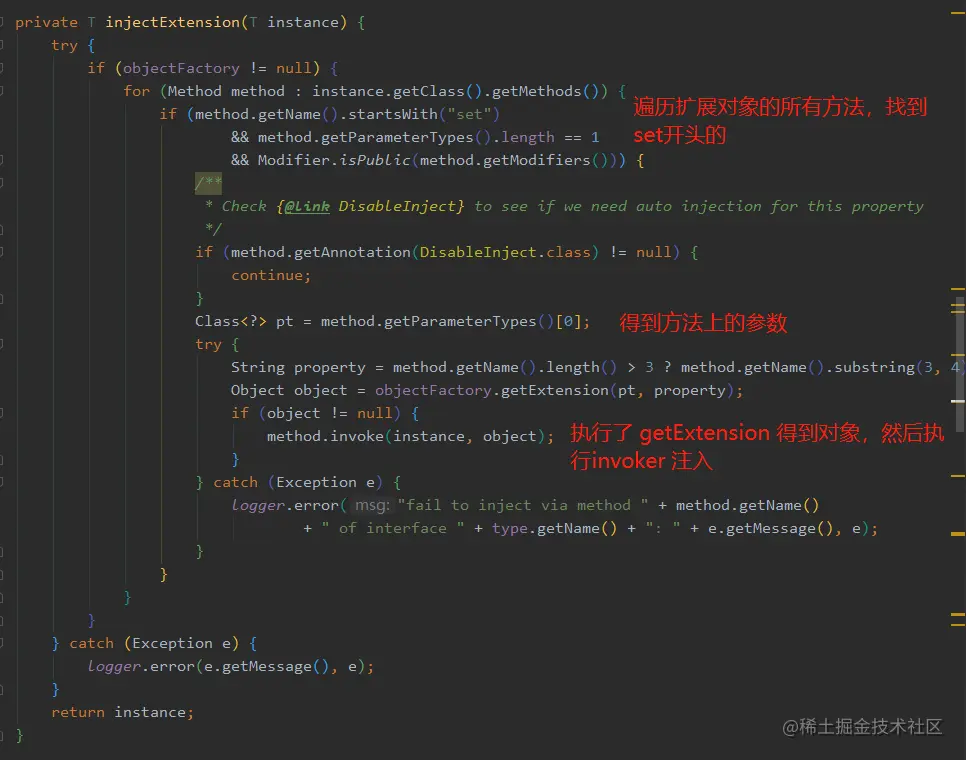 接下来我们再来看看 injectExtension,是如何实现 Dubbo 的自动注入。