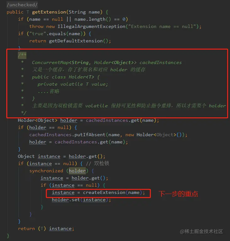 现在有了 ExtensionLoader,咱们再来看看 getExtension 的逻辑,来看看是如何通过扩展点 name 找到对应的实现类的。