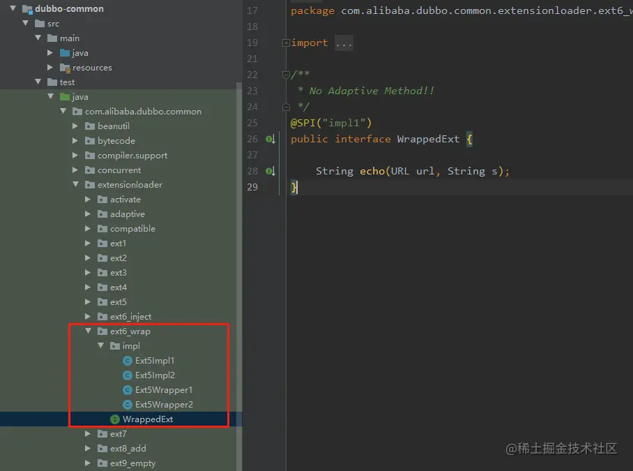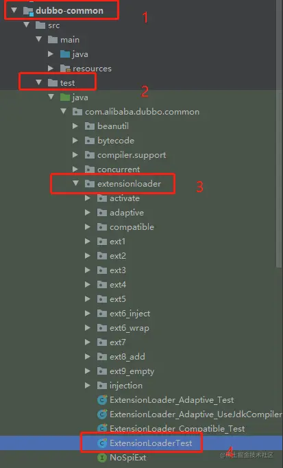 比如今天文章的 ExtensionLoader ,它在 dubbo-common 模块中,咱们就进入 test 来看看它测试用例怎么写的。