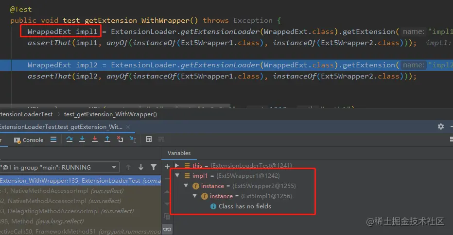 然后再看一下单元测试的运行结果,可以看到最终返回的其实是 Ext5Wrapper1 对象,并且它还包着 wrapper2 对象。