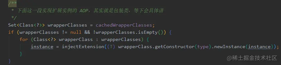 把扩展类对应的包装类都记录下来放在 cachedWrapperClasses 中,然后在实例化扩展类的时候就一层一层的把扩展类包起来,最终返回的就是包装类。