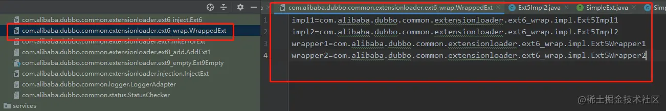 从图中可以看到有两个扩展实现类,两个包装类,具体逻辑就不看了,不是重点,配置文件如下: