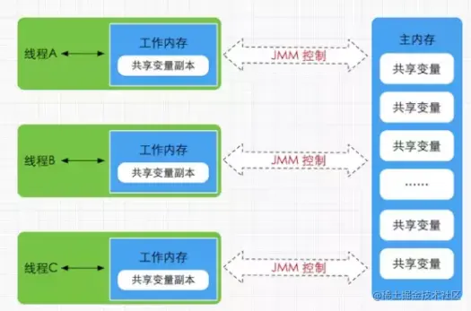 Java内存模型(即Java Memory Model,简称JMM)本身是一种抽象的概念,并不真实存在,它描述的是一组规则或规范,通过这组规范定义了程序中各个变量(包括实例字段,静态字段和构成数组对象的元素)的访问方式。由于JVM运行程序的实体是线程,而每个线程创建时JVM都会为其创建一个工作内存(有些地方称为栈空间),用于存储线程私有的数据,而Java内存模型中规定所有变量都存储在主内存,主内存是共享内存区域,所有线程都可以访问,但线程对变量的操作(读取赋值等)必须在工作内存中进行,首先要将变量从主内存拷贝的自己的工作内存空间,然后对变量进行操作,操作完成后再将变量写回主内存,不能直接操作主内存中的变量,工作内存中存储着主内存中的变量副本拷贝,前面说过,工作内存是每个线程的私有数据区域,因此不同的线程间无法访问对方的工作内存,线程间的通信(传值)必须通过主内存来完成,其简要访问过程如下图,