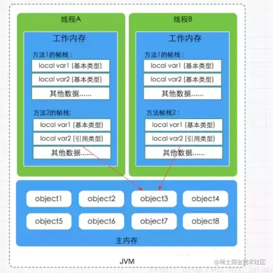 弄清楚主内存和工作内存后,接了解一下主内存与工作内存的数据存储类型以及操作方式,根据虚拟机规范,对于一个实例对象中的成员方法而言,如果方法中包含本地变量是基本数据类型(boolean,byte,short,char,int,long,float,double),将直接存储在工作内存的帧栈结构中,但倘若本地变量是引用类型,那么该变量的引用会存储在功能内存的帧栈中,而对象实例将存储在主内存(共享数据区域,堆)中。但对于实例对象的成员变量,不管它是基本数据类型或者包装类型(Integer、Double等)还是引用类型,都会被存储到堆区。至于static变量以及类本身相关信息将会存储在主内存中。需要注意的是,在主内存中的实例对象可以被多线程共享,倘若两个线程同时调用了同一个对象的同一个方法,那么两条线程会将要操作的数据拷贝一份到自己的工作内存中,执行完成操作后才刷新到主内存,简单示意图如下所示: