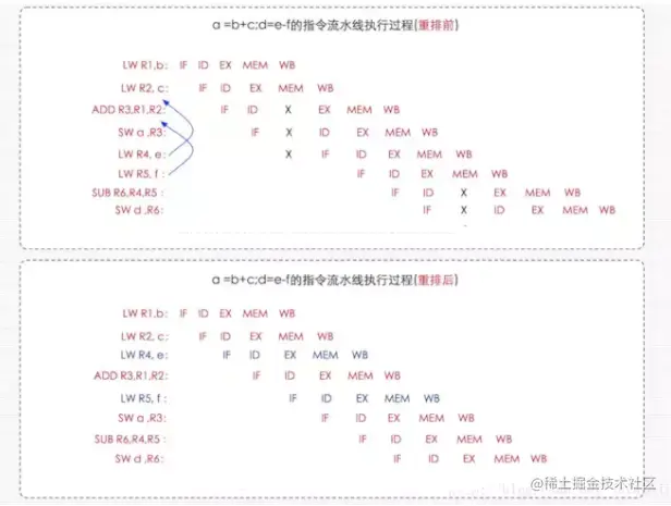 正如上图所示,所有的停顿都完美消除了,指令流水线也无需中断了,这样CPU的性能也能带来很好的提升,这就是处理器指令重排的作用。