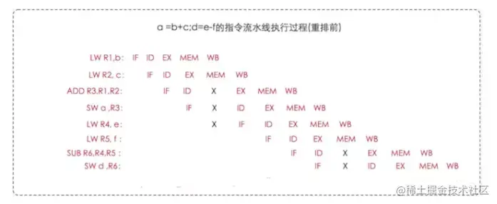 上述便是汇编指令的执行过程,在某些指令上存在X的标志,X代表中断的含义,也就是只要有X的地方就会导致指令流水线技术停顿,同时也会影响后续指令的执行,可能需要经过1个或几个指令周期才可能恢复正常,那为什么停顿呢?这是因为部分数据还没准备好,如执行ADD指令时,需要使用到前面指令的数据R1,R2,而此时R2的MEM操作没有完成,即未拷贝到存储器中,这样加法计算就无法进行,必须等到MEM操作完成后才能执行,也就因此而停顿了,其他指令也是类似的情况。前面阐述过,停顿会造成CPU性能下降,因此我们应该想办法消除这些停顿,这时就需要使用到指令重排了,如下图,既然ADD指令需要等待,那我们就利用等待的时间做些别的事情,如把LW R4,e 和 LW R5,f 移动到前面执行,毕竟LW R4,e 和 LW R5,f执行并没有数据依赖关系,对他们有数据依赖关系的SUB R6,R5,R4指令在R4,R5加载完成后才执行的,没有影响,过程如下: