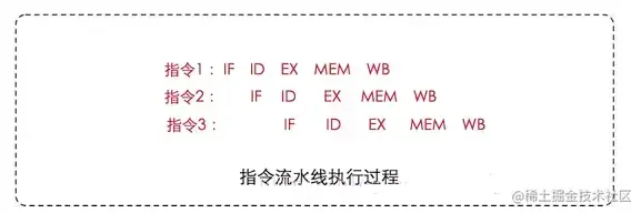 CPU在工作时,需要将上述指令分为多个步骤依次执行(注意硬件不同有可能不一样),由于每一个步会使用到不同的硬件操作,比如取指时会只有PC寄存器和存储器,译码时会执行到指令寄存器组,执行时会执行ALU(算术逻辑单元)、写回时使用到寄存器组。为了提高硬件利用率,CPU指令是按流水线技术来执行的,如下: