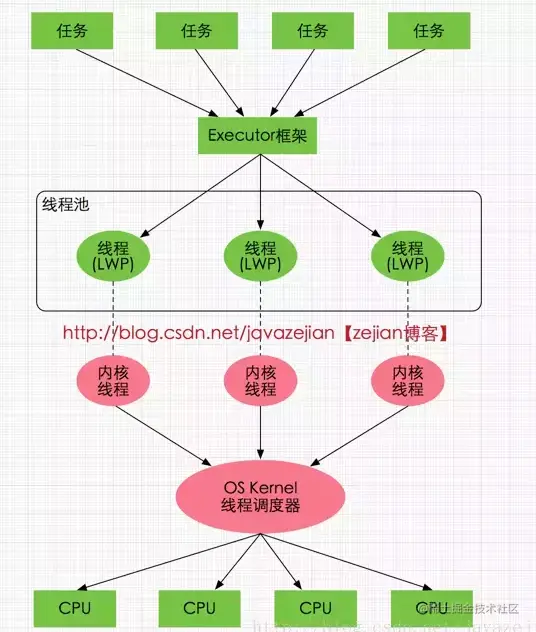 了解完硬件的内存架构后,接着了解JVM中线程的实现原理,理解线程的实现原理,有助于我们了解Java内存模型与硬件内存架构的关系,在Window系统和Linux系统上,Java线程的实现是基于一对一的线程模型,所谓的一对一模型,实际上就是通过语言级别层面程序去间接调用系统内核的线程模型,即我们在使用Java线程时,Java虚拟机内部是转而调用当前操作系统的内核线程来完成当前任务。这里需要了解一个术语,内核线程(Kernel-Level Thread,KLT),它是由操作系统内核(Kernel)支持的线程,这种线程是由操作系统内核来完成线程切换,内核通过操作调度器进而对线程执行调度,并将线程的任务映射到各个处理器上。