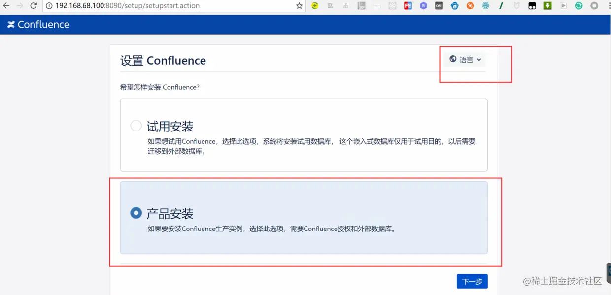 进入浏览器访问,如果是英文可以选择【语言】中文,选择【产品安装