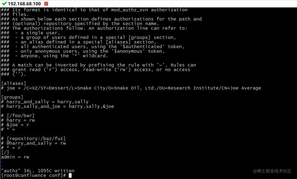 编辑 authz 文件 [/]:表示根目录,即 /var/svnrepos admin = rw:表示用户luo对根目录具有读写权限。