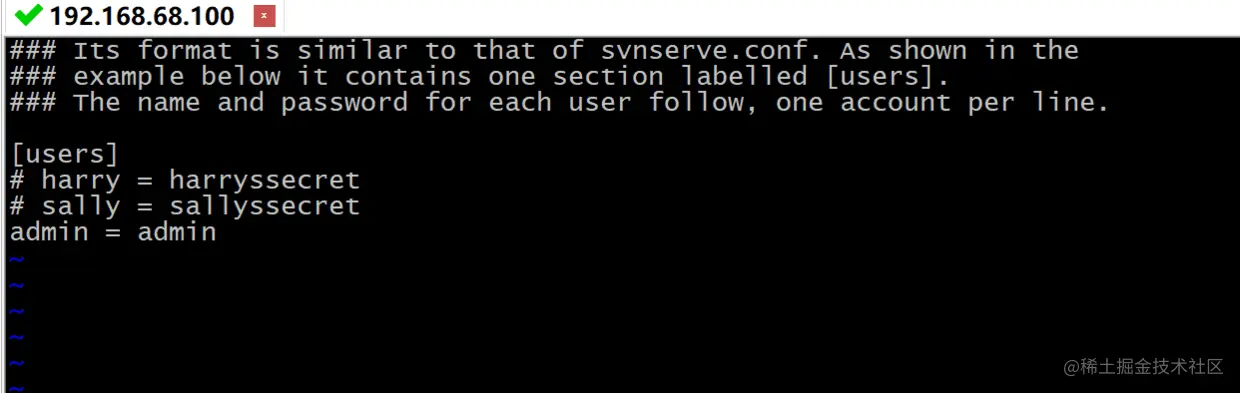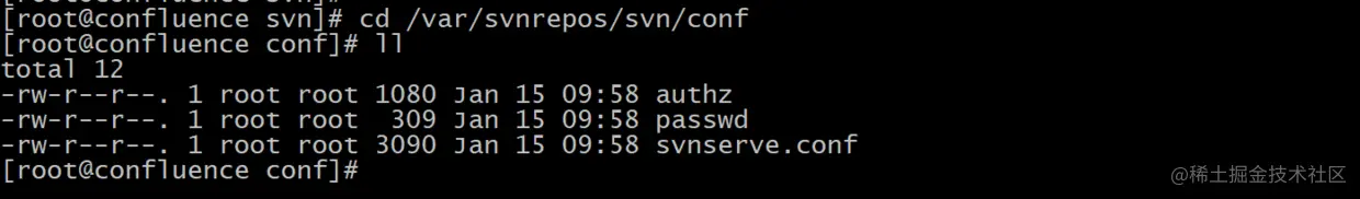 authz:负责账号权限的管理,控制账号是否读写权限 passwd:负责账号和密码的用户名单管理 svnserve.conf:svn服务器配置文件