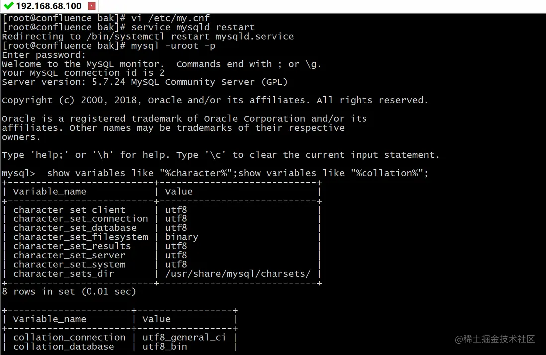 最后是重启mysqld,并登陆mysqld查看字符集,创建数据库的时候设置的密码是:1qaz@WSX