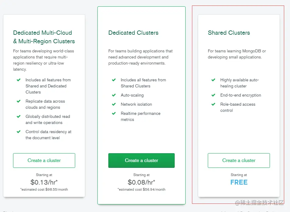选择 shared clusters 即可,这个是免费的,其他的要收费