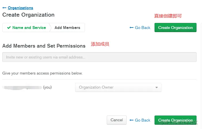 填好组织名称和服务类型后,会跳转到一个新的页面,这个页面可以配置成员,目前可以不用管直接点击 Create Organization 按钮