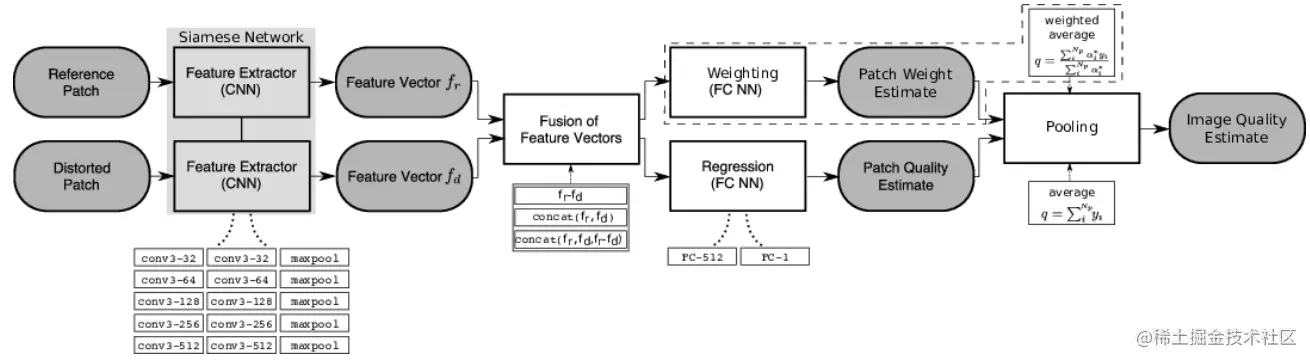 对于FR-IQA问题,reference patch和distorted patch经过feature extractor得到两个512的向量,然后在fusion阶段使用concat拼接在一起,除了这两个,还把两个特征向量的差值也一同拼接进来,显式的把两个特征的区别也作为特征了,总之是这个样子的: