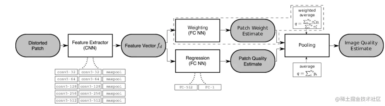 在fusion features vector后面有两个部分,一个是回归,一个是weights;关于如何从很多的patches中得到整个图片的质量分数,作者给出了两个方法: 这个patch是从图像中无重叠的采样
