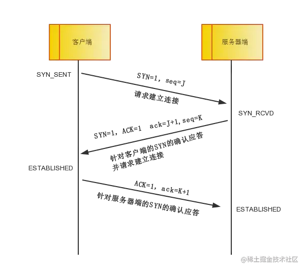 - 客户端发送数据包(SYN=1 Sequence number = J),将客户端状态变为SYN_SENT,该数据包意思是请求建立连接