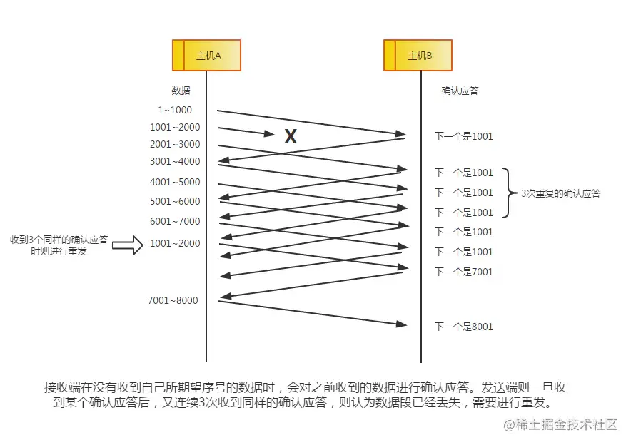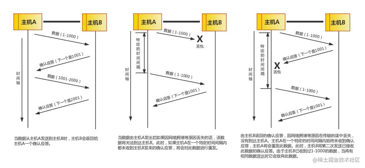 - 接收方丢确认应答:发送方发送一个数组包(Sequence number),接收方收到数组包后返回一个确认应答(Acknowledgment number = Sequence number + 1),但是确认应答丢包,发送方等待一段时间后没有收到确认应答,采用重发相同数据包,接收方判断此为相同数据包,会丢弃该数据,但是仍然会发送一个确认应答包
