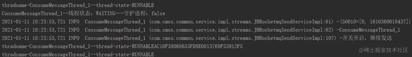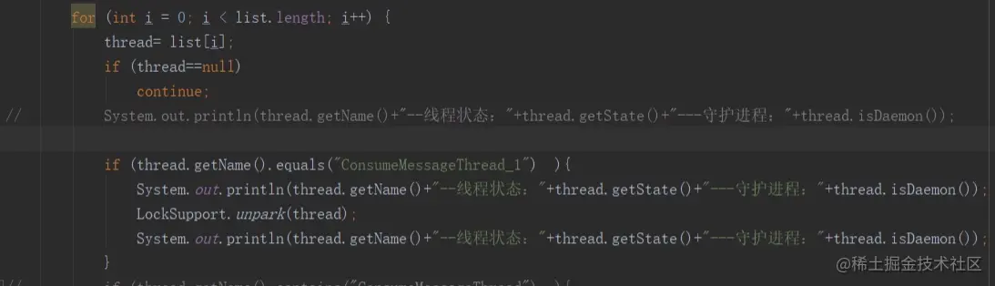 消息队列消费线程业务逻辑中手动调用LockSuppor.park()方法,使得线程进入wating状态,通过定时任务,手动调用LockSupport.unpark(thread)方法将ComsumeMessageThread-1线程唤醒,