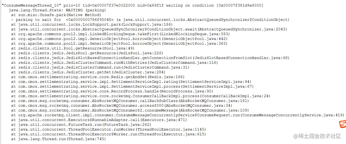 4, 通过运维人员对162服务器当时服务进程进行dump,通过分析日志发现服务中对应消息消费线程均处于wating状态,触发消息消费线程进行wating状态的是一部分是由于服务从jedis连接池获取连接异常导致的,另一部分通过验证是消息消费线程未从消息队列中获取到消息,进而进入wating状态等待消息队列中进入消息。