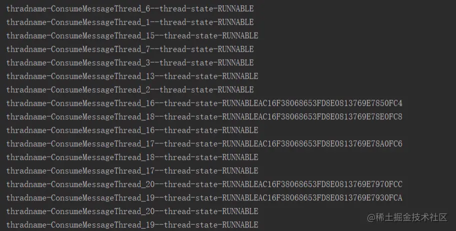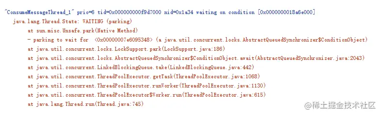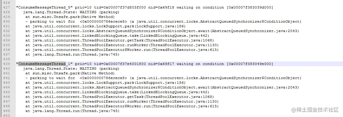 5、当所有队列消息消费结束后,进行线程日志dump,明确consumeMessageThread_1当前wating状态日志与生产日志中编号1、5线程日志一致,进一步确定生产中1、5线程当时是由于未获取到消息而进入wating状态。