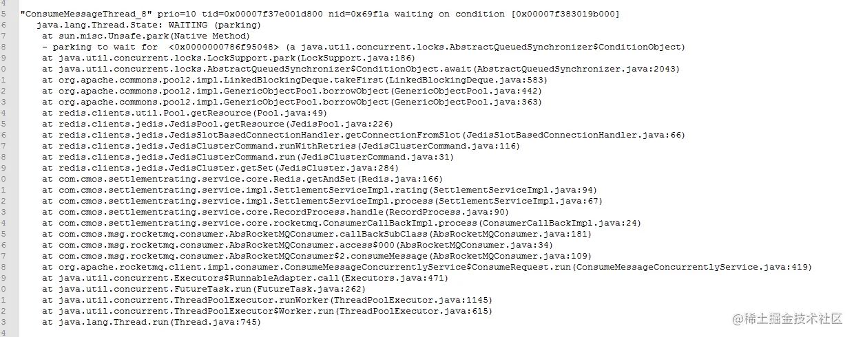 JDK线程日志分析:从日志中可以确认编号为8、10的消费线程由于并发获取redis连接异常进入wating状态,而编号1、5的消费线程由于未获取到消息而进入wating状态。