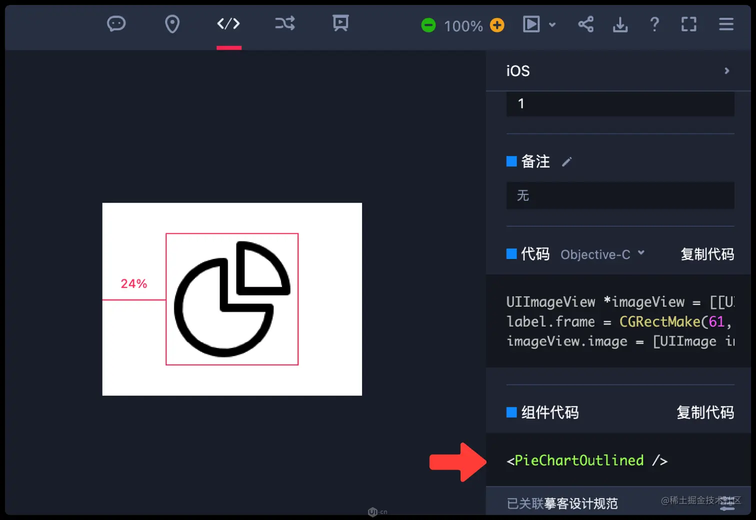 设计师在设计资源库中设定好对应的变量名、组件代码。工程师就立刻能在查看标注时,同步获取到这些信息。再也不需要费时费力去检索开发文档,纠结变量使用是否正确,大大减轻了工程师与设计交接时的负担。