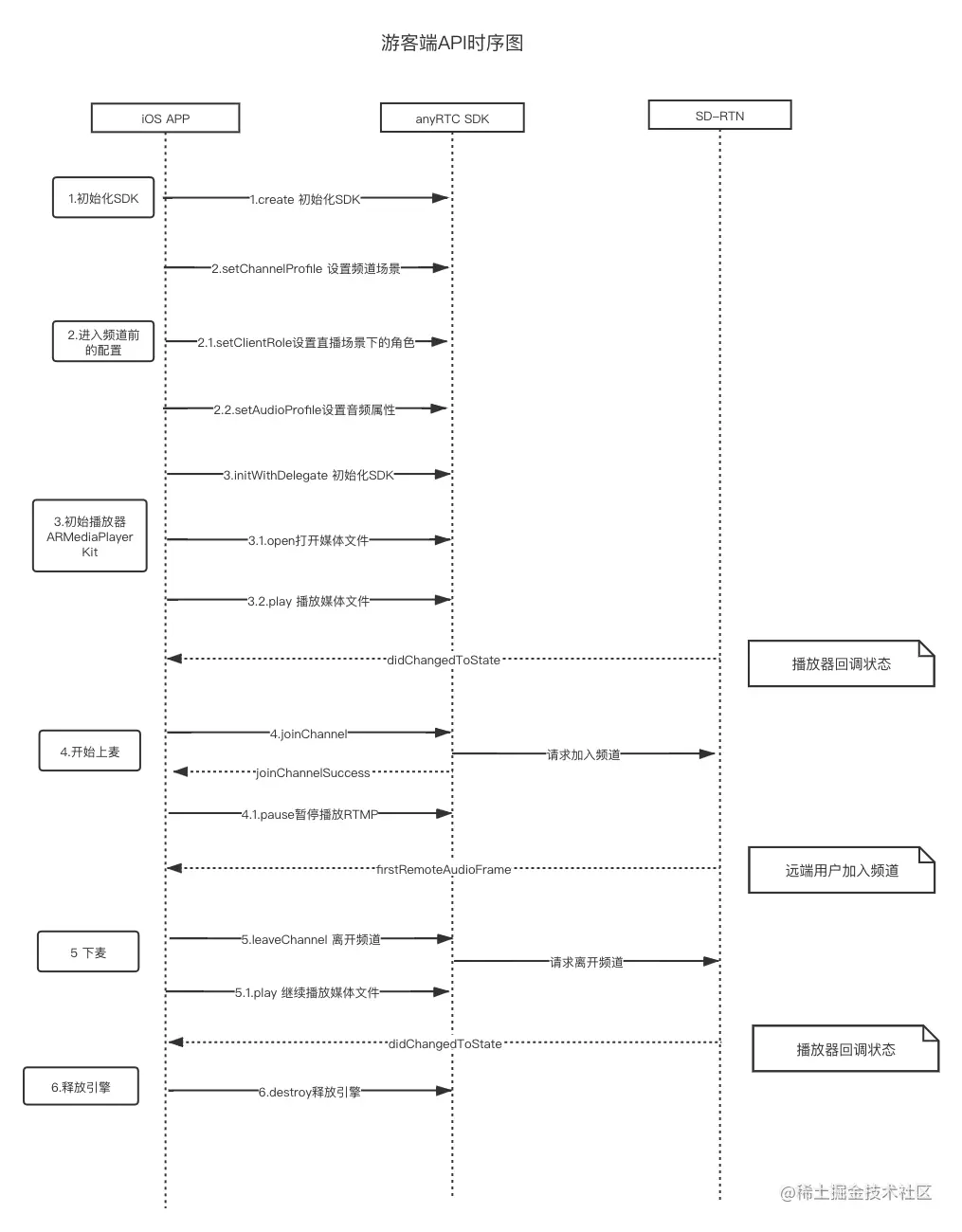 流程: 游客初始化RTC后,初始化播放器,播放RTMP,申请连麦通过后,调用加入频道方法,加入频道成功后,停止播放RTMP。下麦后,调用leaveChannel,并调用播放器的播放进行播放RTMP流: