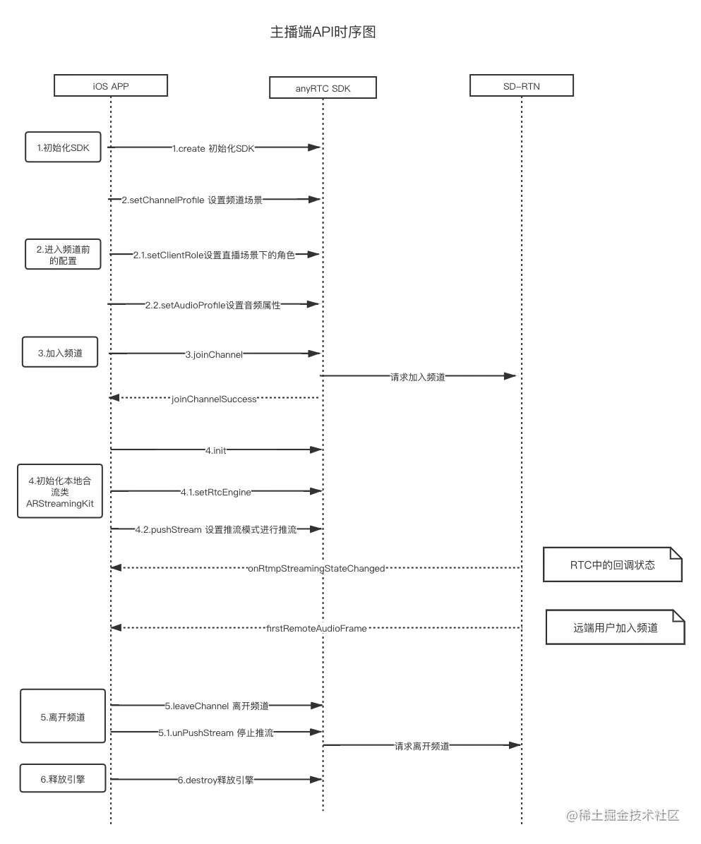 流程: 主播初始化RTC后,并设置频道属性为直播模式,并设置自己的角色为主播,加入频道成功后,设置推流转码配置并设置推流地址进行推流。有用户上麦或者下麦更新推流配置即可,服务端根据配置是否更新合流的操作。