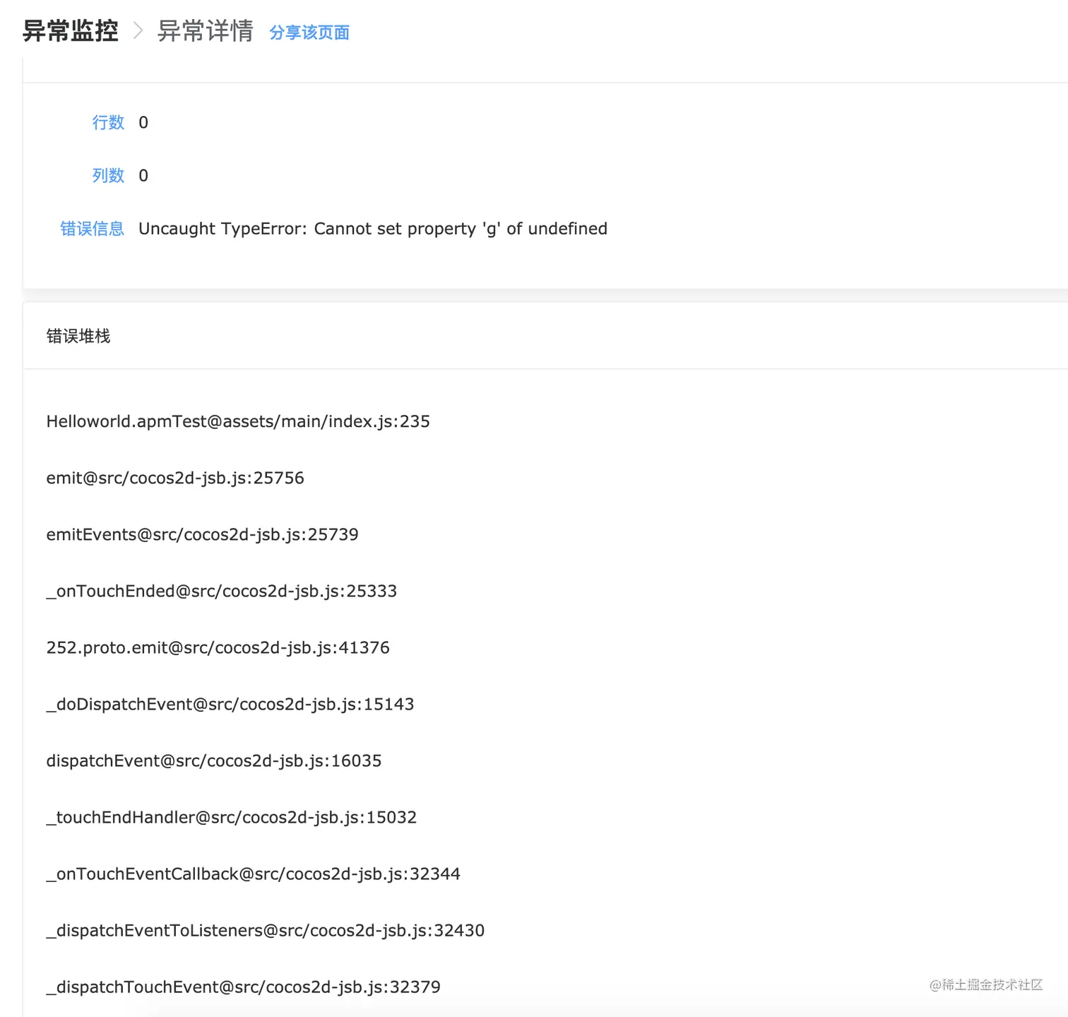 cocos在js-binding会调用全局的__errorHandler函数, 传入发生异常的文件路径, 行数, 错误信息以及调用栈, 类似window.onerror = function(message, source, lineno, colno, error) { ... }