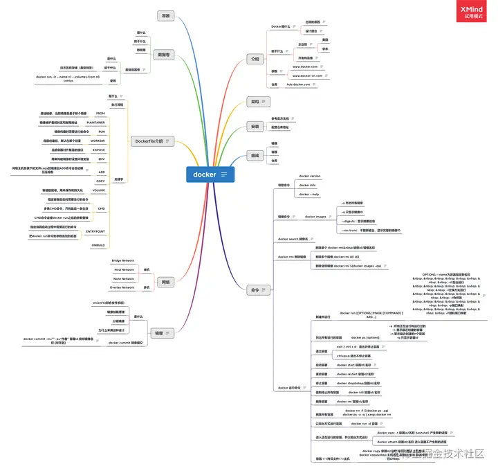 来看Docker思维脑图:介绍-架构-安装-组成-命令-镜像-容器