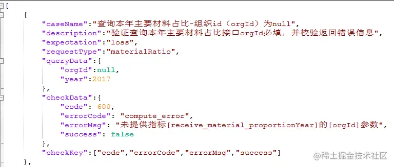 用例包含了用例名称(caseName),用例描述(description),期望调用结果(expectation),自动化业务类型(requestType),入参(queryData),预期结果(checkData)****,结果校验字段(checkKey);可根据自动化框架需要,灵活设置自己的用例参数。