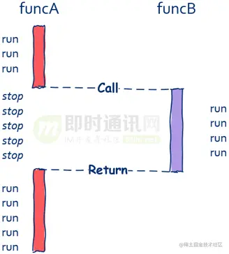 注意:一般来说,像这种同步调用,funcA和funcB是运行在同一个线程中的,这是最为常见的情况。