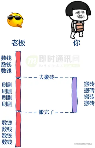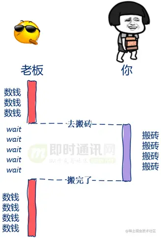在这里主线程就好比监工的老板,数据库线程就好比苦逼搬砖的程序员,在搬完砖前老板什么都不做只是紧紧的盯着你,等你搬完砖后才去忙其它事情。