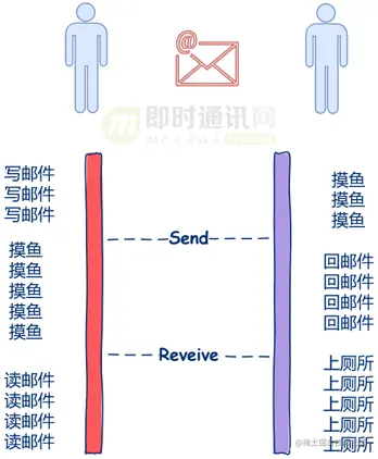 你看,在这个场景下“不依赖”,“无关联”,“无需等待”这些关键词就出现了,因此邮件这种沟通方式就是异步的。