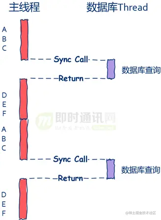 这就是最为典型的同步方法:主线程在发出数据库查询请求后就会被阻塞而暂停运行,直到数据库查询完毕后面的D、E、F才可以继续运行。