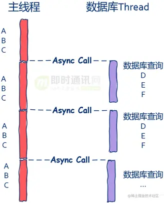 在这种情况下,主线程根本就不关心数据库是否查询完毕,数据库查询完毕后自行处理接下来的D、E、F三个步骤。