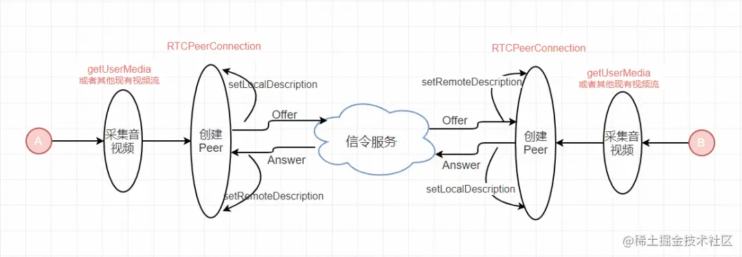 - 每个Peer创建一个RTCPeerConnection对象,用来表示其WebRTC会话端。