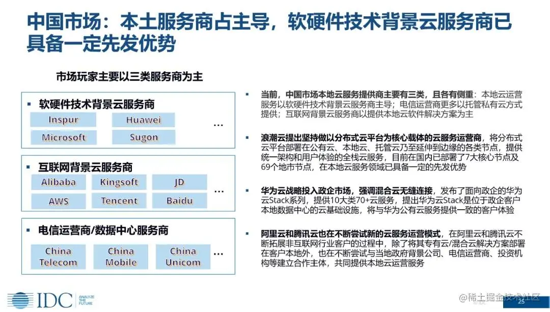 中国本土的本地云服务市场竞争尤为激烈当前,中国市场本地云服务提供商主要有三类,且各有侧重:本地云运营服务以软硬件技术背景云服务商主导;电信运营商更多以托管私有云方式提供;互联网背景云服务商以提供本地云软件解决方案为主。
