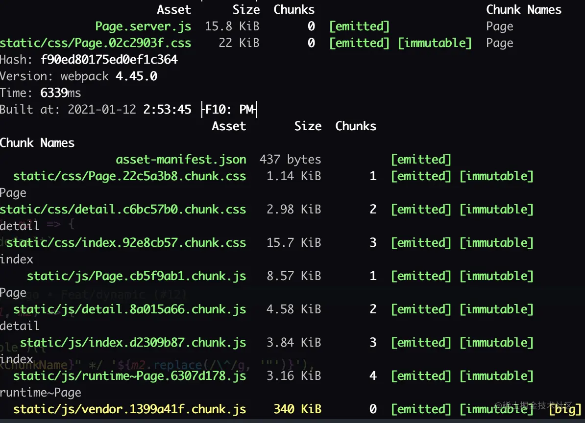 Page.server.js 大小为 15.8kb,客户端bundle分成了 page.chunk index.chunk detail.chunk 由 page.chunk 在运行时动态加载 index.chunk 和 detail.chunk。同样 css 文件也进行了分块