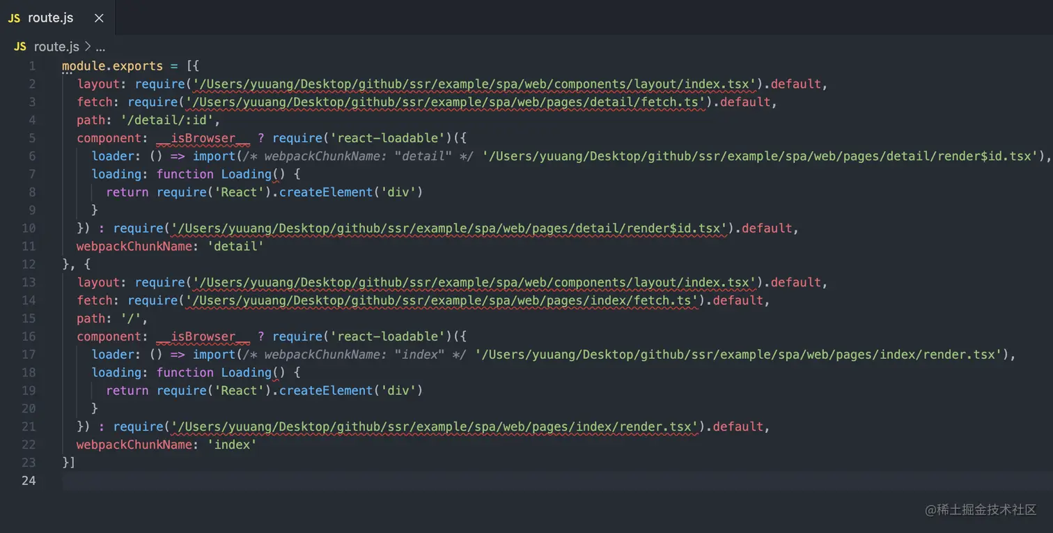 由于我们框架使用的是约定式路由。在生成路由表的时候可以通过文件夹名称来确定chunkName。当然使用声明式路由的也可以通过简单的约定来定义 chunkName 完整代码参考:github.com/ykfe/ssr/bl…