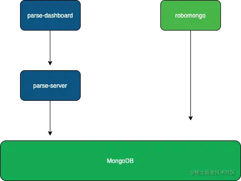 parse-dashboard 和 Robomongo 的最大不同之处在于工具背后的连接主体不同,下图展示了两款工具的连接使用方式