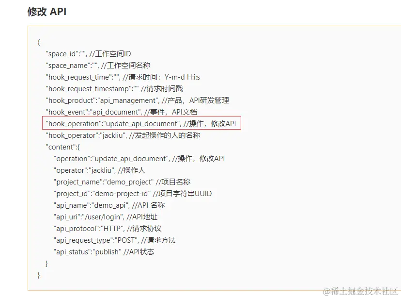 而对接钉钉机器人,则可以在 工作空间设置 - webhook 中新增回调地址,先在回调脚本中接收到Eolinker的信息,再通过脚本调用传参,拿到并判断下图红框的字段,识别为 修改 操作,最后就可以调用钉钉机器人的Webhook地址发送信息。