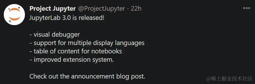 日前JupyterLab官方博客发布消息宣布正式发布JupyterLab3.0,作为一次大版本升级,JupyterLab 3.0这次改进颇多,除了对扩展系统进行了重大改进之外。主要增加的功能有: 加入中文等多语言界面、新的可视化调试器、改进的简单界面模式、更清晰的文档目录等等 。JupyterLab是个非常有意义的项目,可以方便和改善我们的数据分析和Web化开发体验。